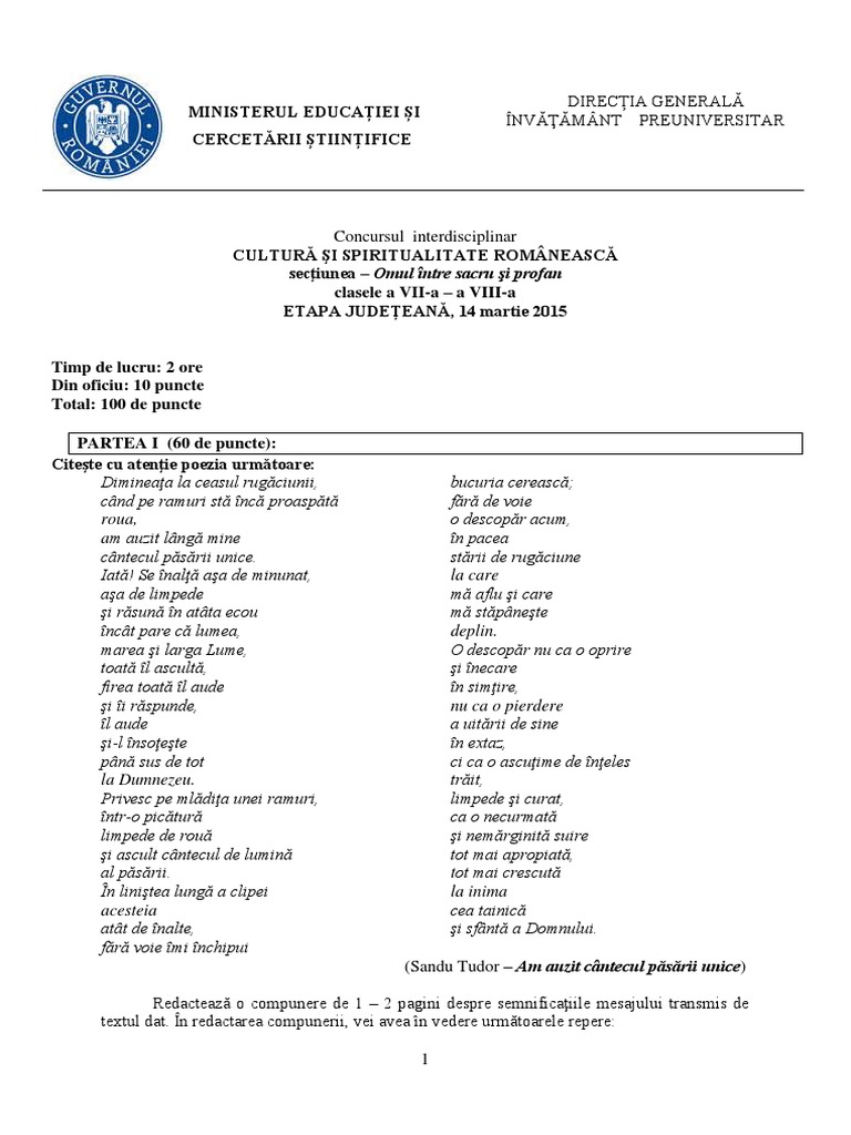 Cultura Si Spiritualitate Romaneasca Subiecte 2018